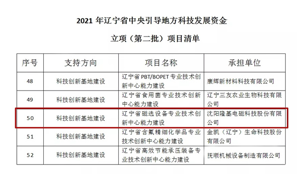 近日,隆基電磁“遼寧省磁選設備專業技術創新中心能力建設”項目成功入選“遼寧省2021年中央引導地方科技發展資金立項(第二批)項目”。