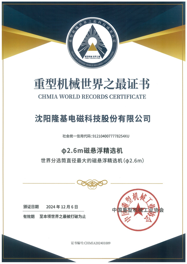 Φ2.6m磁懸浮精選機(LJC-26000)憑借卓越的技術性能和創新性,被認定為“世界分選筒直徑最大的磁懸浮精選機(Φ2.6m) 2025-01-01
