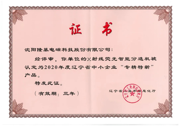 近日,遼寧省工業(yè)和信息化廳公布了2020年全省“專精特新”企業(yè)和產(chǎn)品名單。隆基電磁榮膺“遼寧省專精特新中小企業(yè)”稱號,公司“X射線熒光智能分選機(jī)”喜獲“遼寧省中小企業(yè)專精特新產(chǎn)品”稱號。