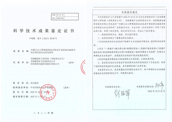 由沈陽隆基電磁科技股份有限公司、包鋼集團礦山研究院(有限責任公司)、包鋼蒙普礦業有限責任公司共同完成的“內蒙古白云鄂博超難選含鐵巖礦高效綠色磁懸浮綜合利用技術及應用研究”通過“中綠盟”組織的科學技術成果鑒定,被認定為國際先進水平。